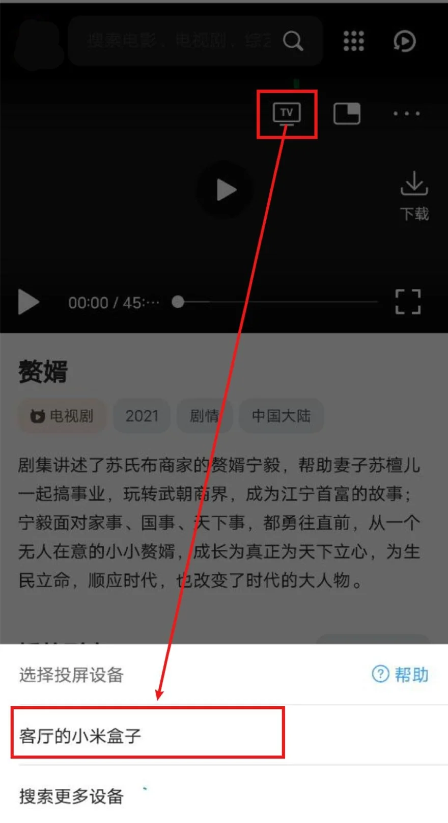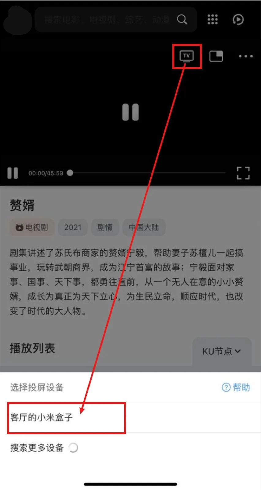 打开QQ浏览器(会接管网页播放器)->打开石头视频->播放视频->选中投屏图标->等待搜寻出智能电视/电视盒子->选中,即可投屏。